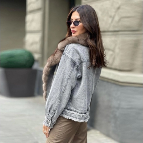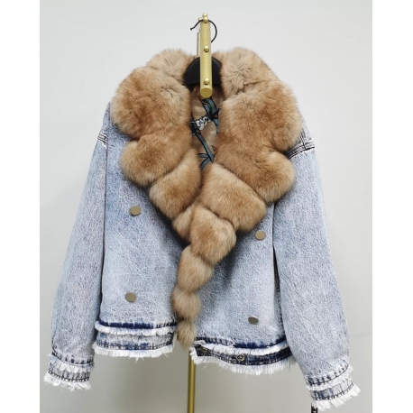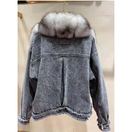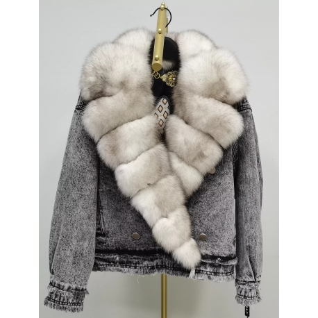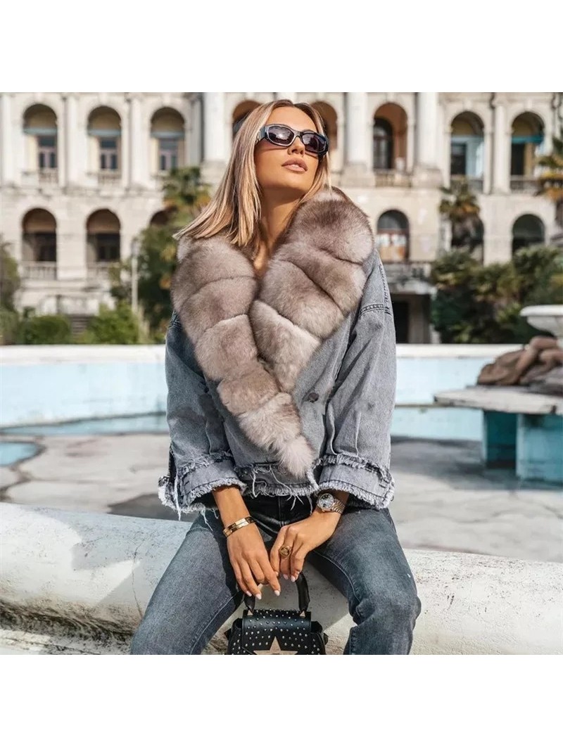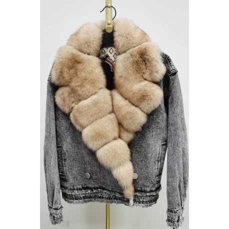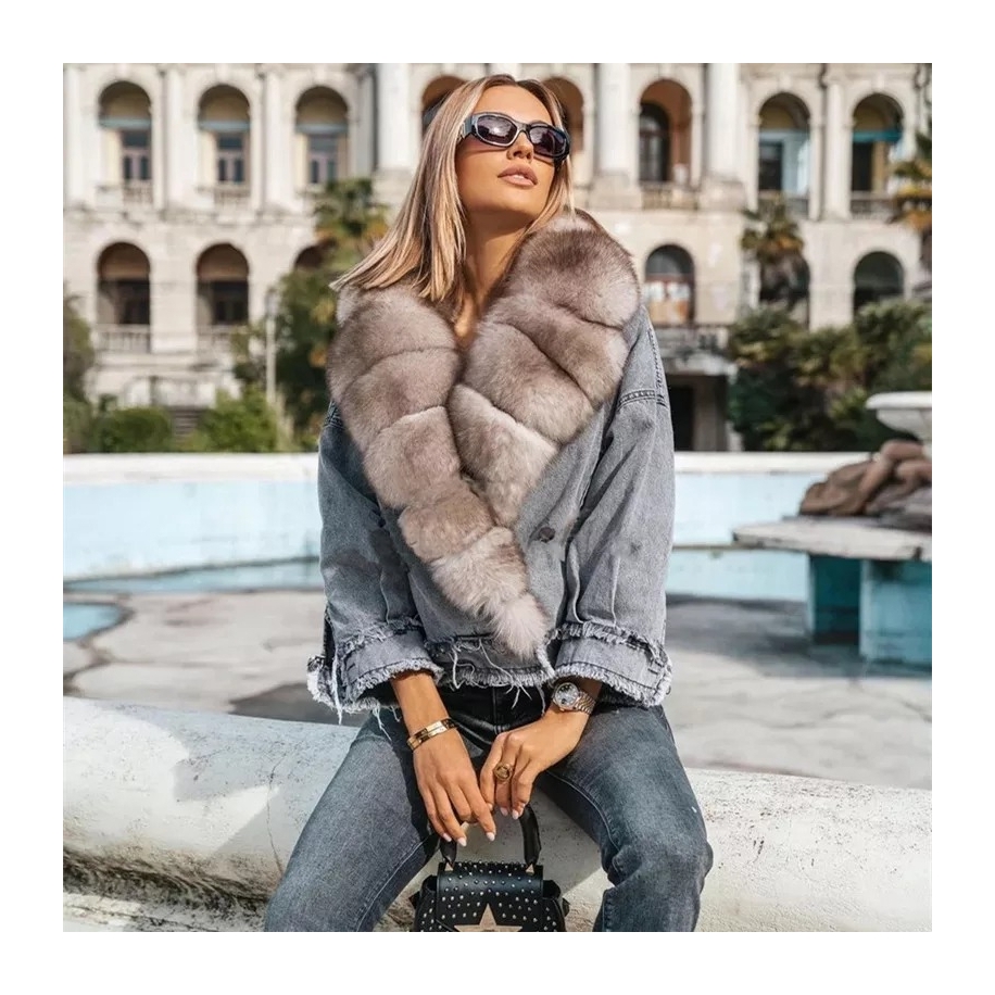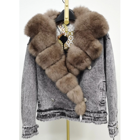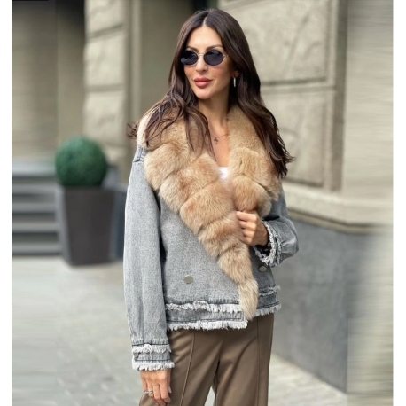 Luxusní džínová bunda, která spojuje styl a eleganci. Tento kousek vyniká mohutným, měkoučkým límcem z pravé liščí kožešiny, který dodává bundě jedinečný a sofistikovaný vzhled. Ideální pro chladnější dny – zahřeje a zároveň působí mimořádně módně.