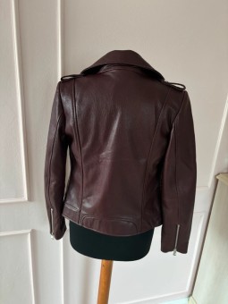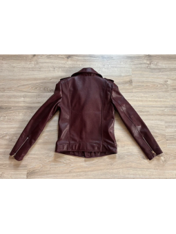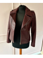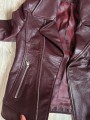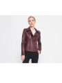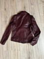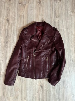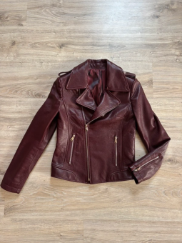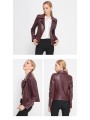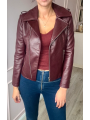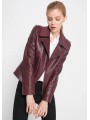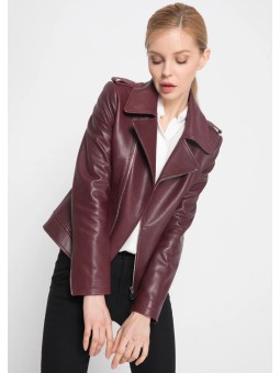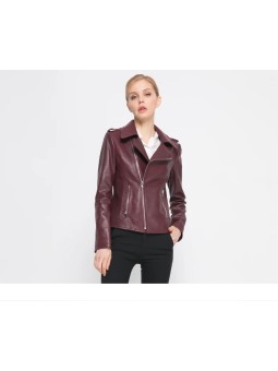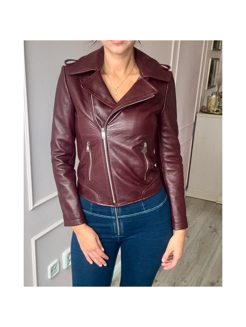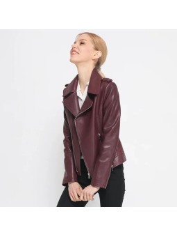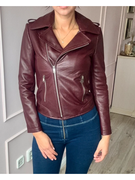 Stylová dámská kožená bunda ve vínové nebo černé barvě. Moderní křivák střihu s asymetrickým zipem a kovovými stříbrnými detaily – zipy na kapsách i rukávech. Bunda má klasický límec s klopami a je vypasovaná, takže krásně zvýrazní postavu.